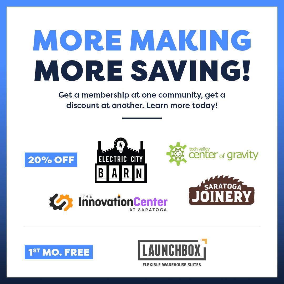 CAPITAL REGION, NY— Albany Barn, Inc.’s Electric City Barn, Tech Valley Center of Gravity, Saratoga Joinery, The Innovation Center at Saratoga, Inc., and Launchbox Flexible Warehouses are coming together to announce a Reciprocal Makerspace Membership Discount beginning April 1, 2026.